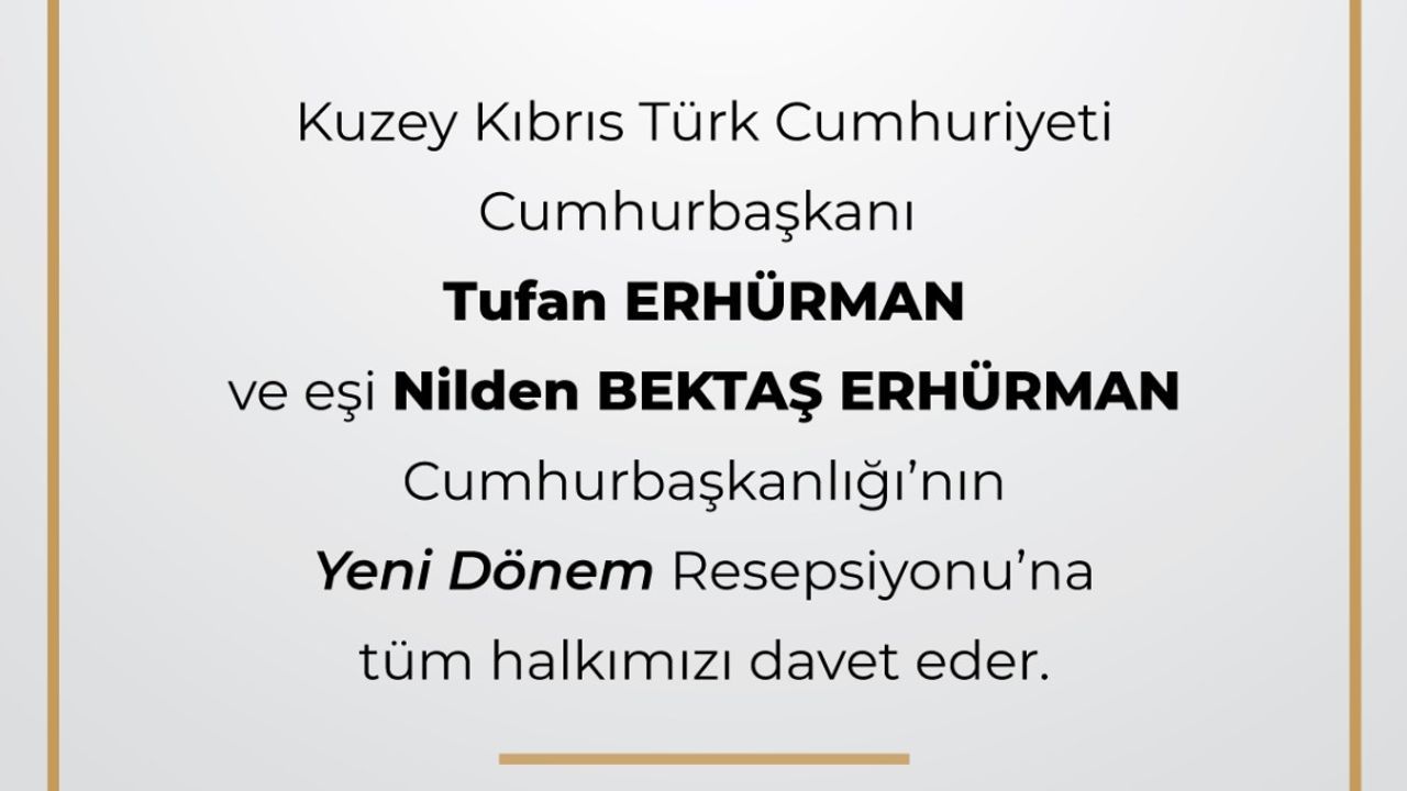 Cumhurbaşkanı Tufan Erhürman ve eşi Nilden Bektaş Erhürman, yarın Cumhurbaşkanlığı'nda Yeni Dönem Resepsiyonu düzenleyecek.