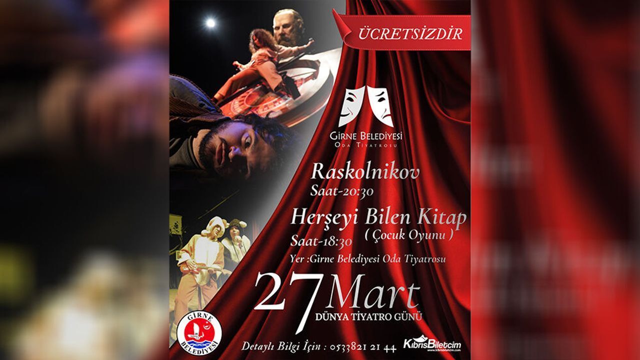 Girne Belediyesi, 27 Mart Dünya Tiyatro Günü kapsamında çocuklara yönelik 'Herşeyi Bilen Kitap' ve yetişkinlere yönelik 'Raskolnikov' isimli oyunları sahneleyecek.