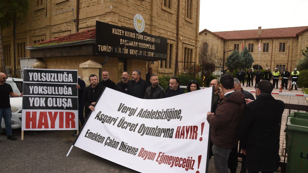 Lefkoşa Terminal Çemberi'nde toplanan Kıbrıs Türk Amme Memurları Sendikası (KTAMS), Kıbrıs Türk Kamu Görevlileri Sendikası (KAMUSEN), Kamu İşçileri Sendikası (KAMU-İŞ), Kıbrıs Türk Öğretmenler Sendikası (KTÖS) ve Kıbrıs Türk Orta Eğitim Öğretmenler Sendikası (KTOEÖS) yetkilileri, sloganlarla Başbakan Yardımcılığı, Turizm, Kültür, Gençlik ve Çevre Bakanlığı önüne yürüdü.