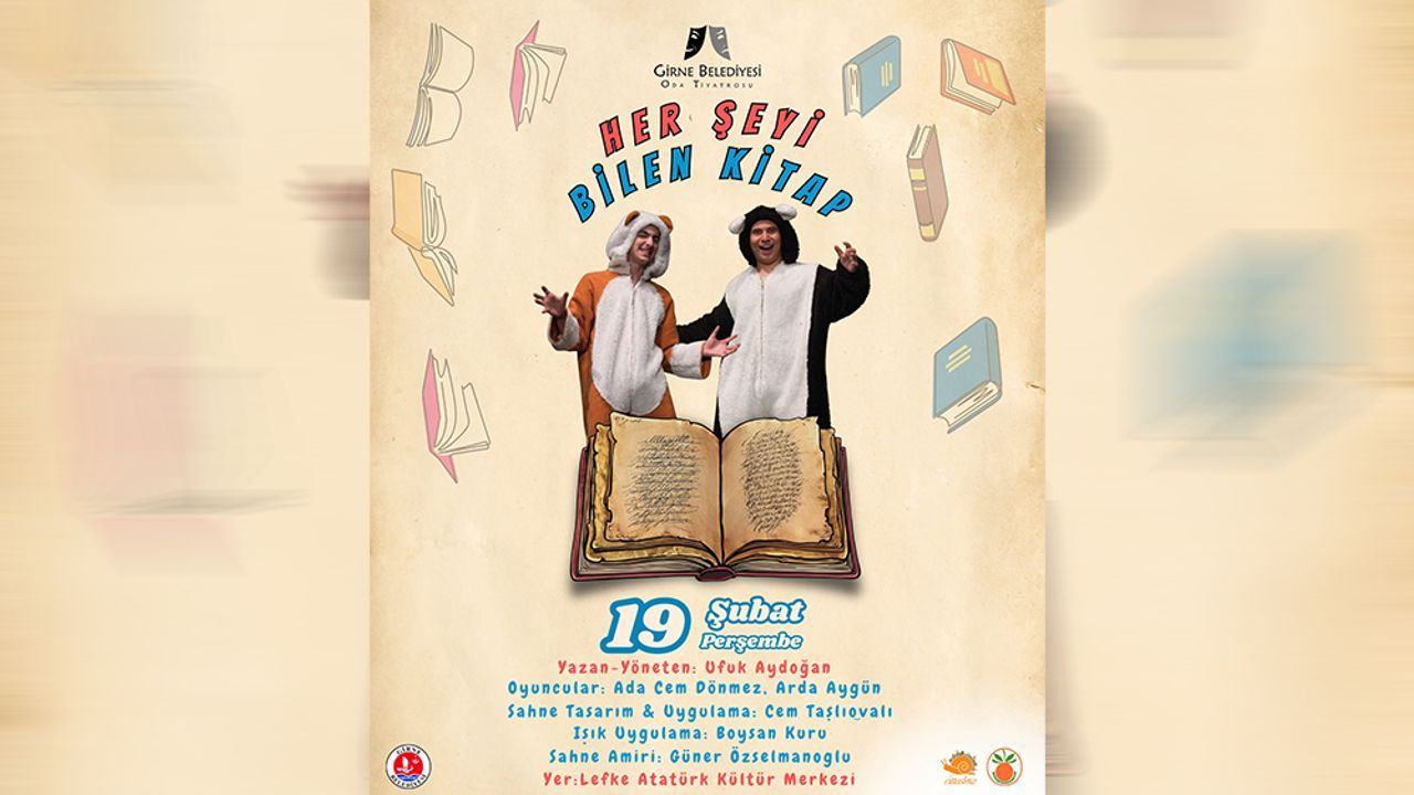 Girne Belediyesi Oda Tiyatrosu, 'Herşeyi Bilen Kitap' çocuk oyununu perşembe günü Lefke Atatürk Kültür Merkezi'nde bölge okullarındaki öğrenciler için sahneleyecek.