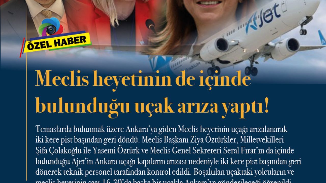 Temaslarda bulunmak üzere Ankara'ya giden Meclis heyetinin uçağı arızalanarak iki kere pist başından geri döndü. Meclis Başkanı Ziya Öztürkler, Milletvekilleri Şifa Çolakoğlu ile Yasemi Öztürk ve Meclis Genel Sekreter Seral Fırat'ın da içinde bulunduğu Ajet'in Ankara uçağı kapıların arızası nedeniyle iki kere pist başından geri dönerek teknik personel tarafından kontrol edildi. Boşaltılan uçaktaki yolcuların ve meclis heyetinin saat 16.30'da başka bir uçakla Ankara'ya gönderileceği öğrenildi.